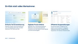 Die CGM one VideoSprechstunde bietet eine sichere, komfortable Patientenbetreuung – ideal für Besprechungen und Nachsorgetermine ohne Praxisbesuch. Funktionen wie Chat, Dokumentenaustausch und Bildschirmübertragung gewährleisten einen reibungslosen Gesprächsablauf. Es sind Gruppensitzungen mit bis zu fünf Teilnehmer möglich. Assistenzaccounts ermöglichen die einfache Organisation von Terminen. Einladungen können per E-Mail und SMS versandt werden. Das virtuelle Wartezimmer unterstützt eine strukturierte Praxisorganisation. Zusätzlich erlaubt die Enterprise-Lösung der CGM one VideoSprechstunde eine vollständige Anpassung an das kundeneigene Corporate Design. Die Abrechnung erfolgt unkompliziert über bestehende Gebührenordnungen. So ist der Service schnell und unkompliziert refinanziert. Ende-zu-Ende-Verschlüsselung, Zertifizierung nach Vorgaben der KBV und des GKV-Spitzenverbandes, C5-Testat und Hosting in Deutschland gewährleisten höchste Sicherheits- und Datenschutzstandards.