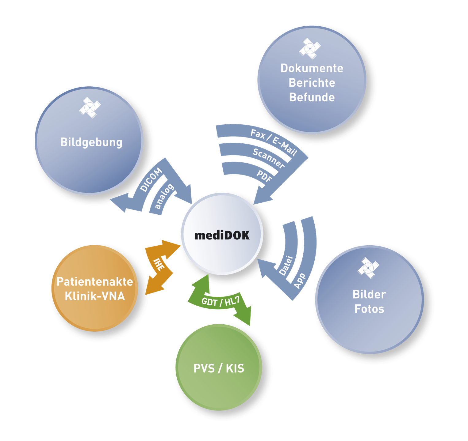 mediDOK unterstützt die GDT-Schnittstelle und kann auf diese Weise in viele weitere PVS-Systeme eingebunden werden.
