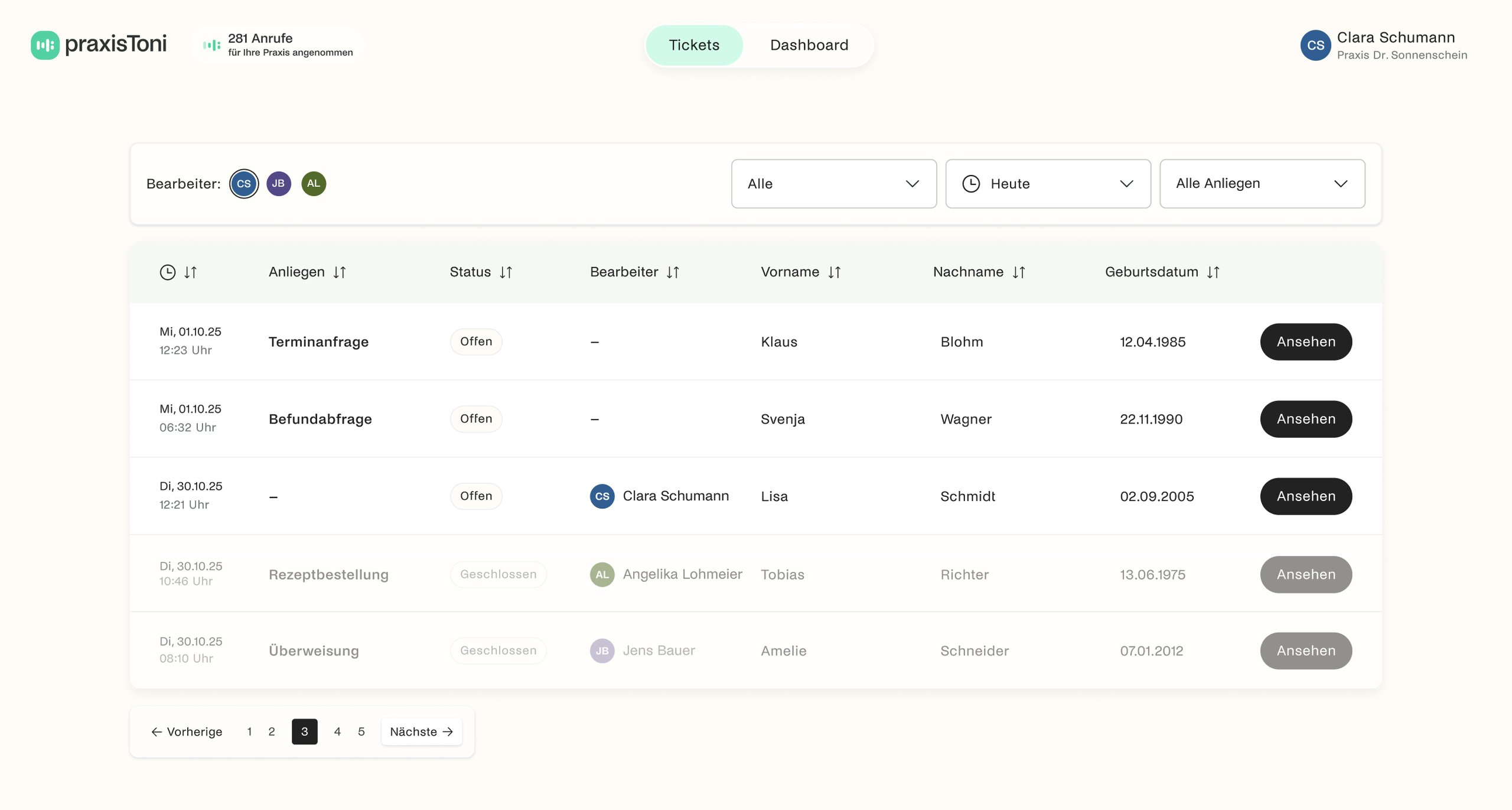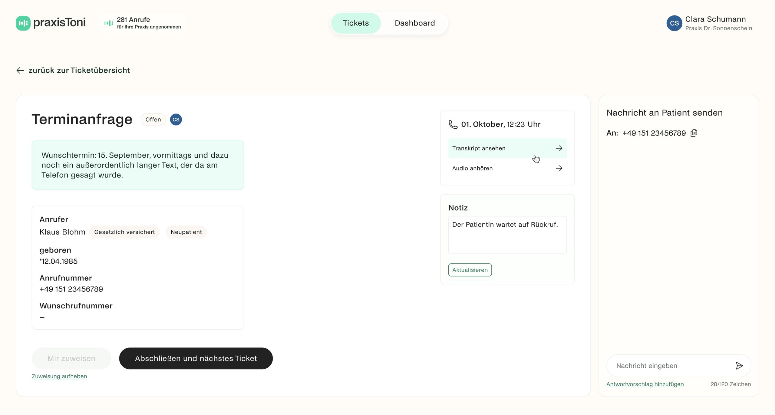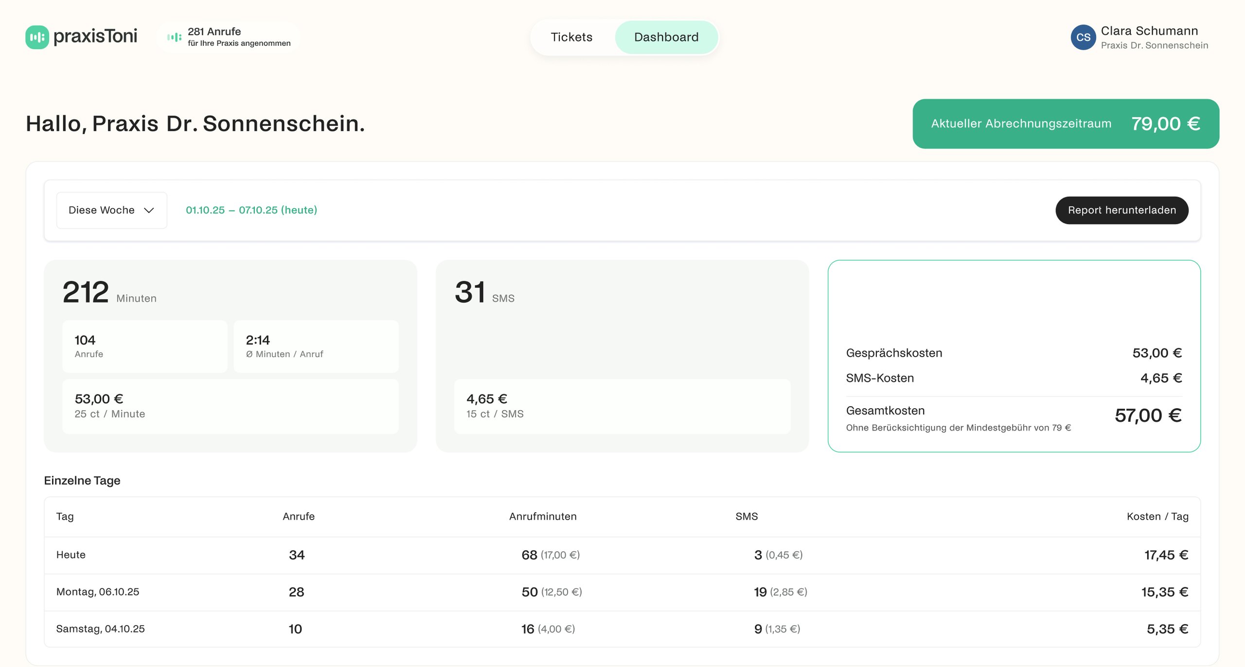 praxisToni ist die digitale Telefonassistentin für Ihre Praxis. Sie entlastet Ihr Team genau dann, wenn keine Kapazitäten für das Telefon vorhanden sind. Toni nimmt eingehende Anrufe zuverlässig entgegen und dokumentiert jedes Anliegen automatisch in einem Ticket, das Sie jederzeit, zeitlich unabhängig bearbeiten können. Sie entscheiden flexibel, wie praxisToni eingesetzt wird: punktuell – etwa zu Stoßzeiten, in Rushhours oder bei krankheitsbedingten Ausfällen im Team – oder dauerhaft als 24/7-Telefonassistenz. Abgerechnet wird transparent und fair: Sie zahlen nur das, was Sie tatsächlich nutzen. Darüber hinaus ermöglicht praxisToni eine gezielte Steuerung Ihrer Anrufe. So können Sie festlegen, welche Anliegen Ihre Praxis erreichen sollen – zum Beispiel bei einem Aufnahmestopp für Neupatientinnen und Neupatienten oder wenn bestimmte Behandlungstermine priorisiert vergeben werden sollen.