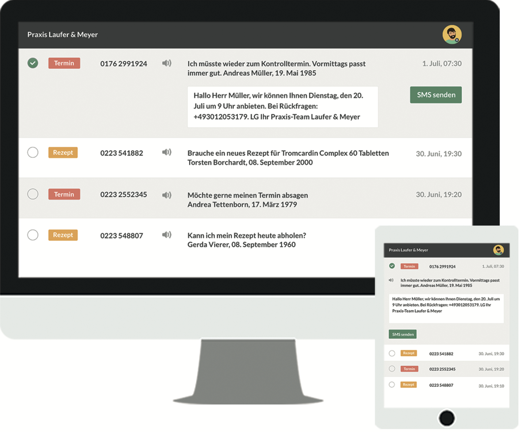 Mithilfe künstlicher Intelligenz erkennt der digitale Helfer in einem freien Dialog gezielt das Anliegen des Anrufs und erfragt die notwendigen Informationen, z.B. zur Terminanfrage oder Rezeptbestellung. Ihr Team sieht in einer Übersicht alle Anrufe und kann per SMS oder Rückruf antworten.