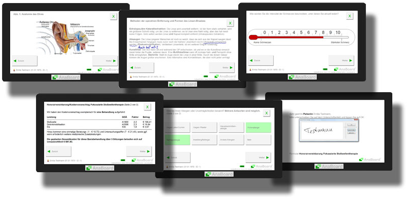 Das AnaBoard® ist ein Software für die digitale Praxis. Es bietet zum Beispiel die papierlosen Anamnese und Pflege der elektronischen Patientenakte. Formulare, Fragebögen und Inhalte zur Patientenaufnahme und -aufklärung können nach Ihren Vorgaben und Wünschen dargestellt werden.