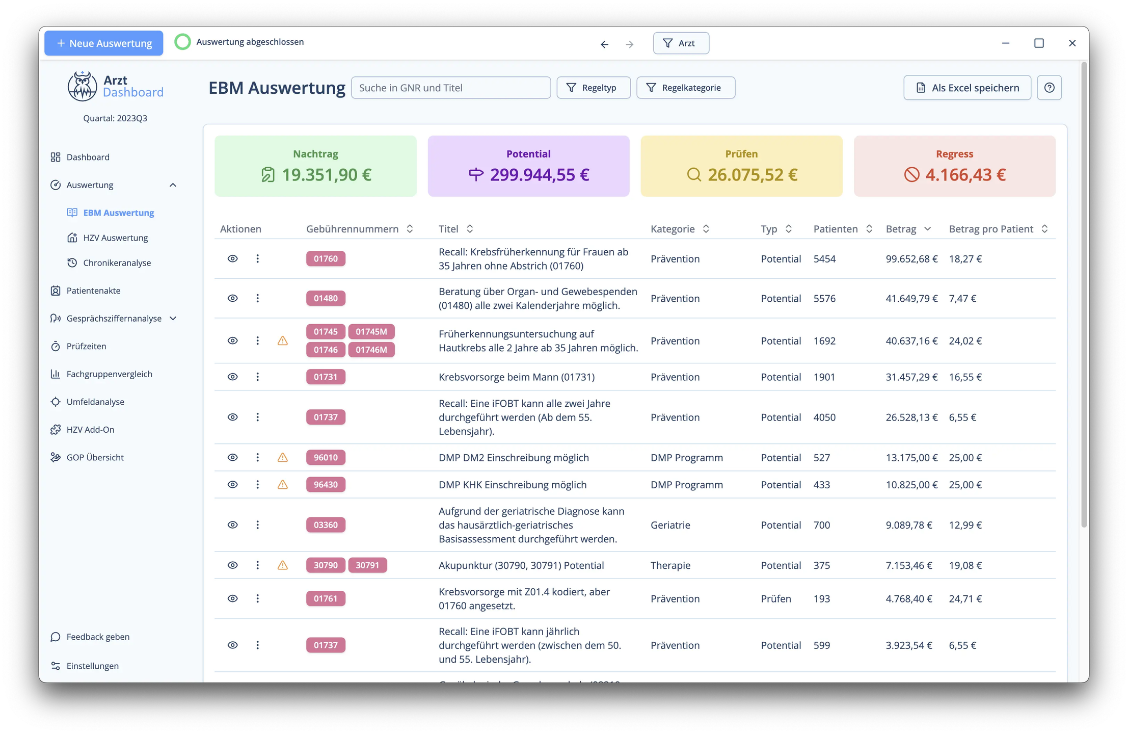 Arzt Dashboard optimiert EBM- und HZV-Abrechnungen für Haus- und Fachärzte sowie MVZ. Es prüft KVDT-Dateien automatisch auf Fehler, erkennt vergessene Ziffern, ungenutzte Potenziale und Regressrisiken basierend auf Tausenden aktueller Regeln inkl. DMP und Sonderverträgen. Mit Datenbankanbindungen und Live-Tool zeigt es Vorschläge direkt im PVS an, genau wo sie hingehören. Patientenakten zeigen Diagnosen, Historie und Optimierungsvorschläge direkt am Fall. Plausibilitätsprüfungen zu Tages-/Quartalsprofilen mit Fachgruppenvergleichen. Spezielle Analysen: Gesprächs-/Psychosomatikziffern (03230, 35100/10), Chronikerpauschalen (03220/21), Geo-Umfeld für NäPa/Hausbesuche. Weitere Features: Nachtragsvorschläge, Exporte (CSV/Excel/PDF), digitale Aufgabenlisten, Offene-Sprechstunde-Tracking (TSVG). Lokal installiert (Windows/macOS), TLS-verschlüsselt, auto-Updates, Support inklusive. Ab 99€/Monat und 30 Tage kostenlos Testen.
