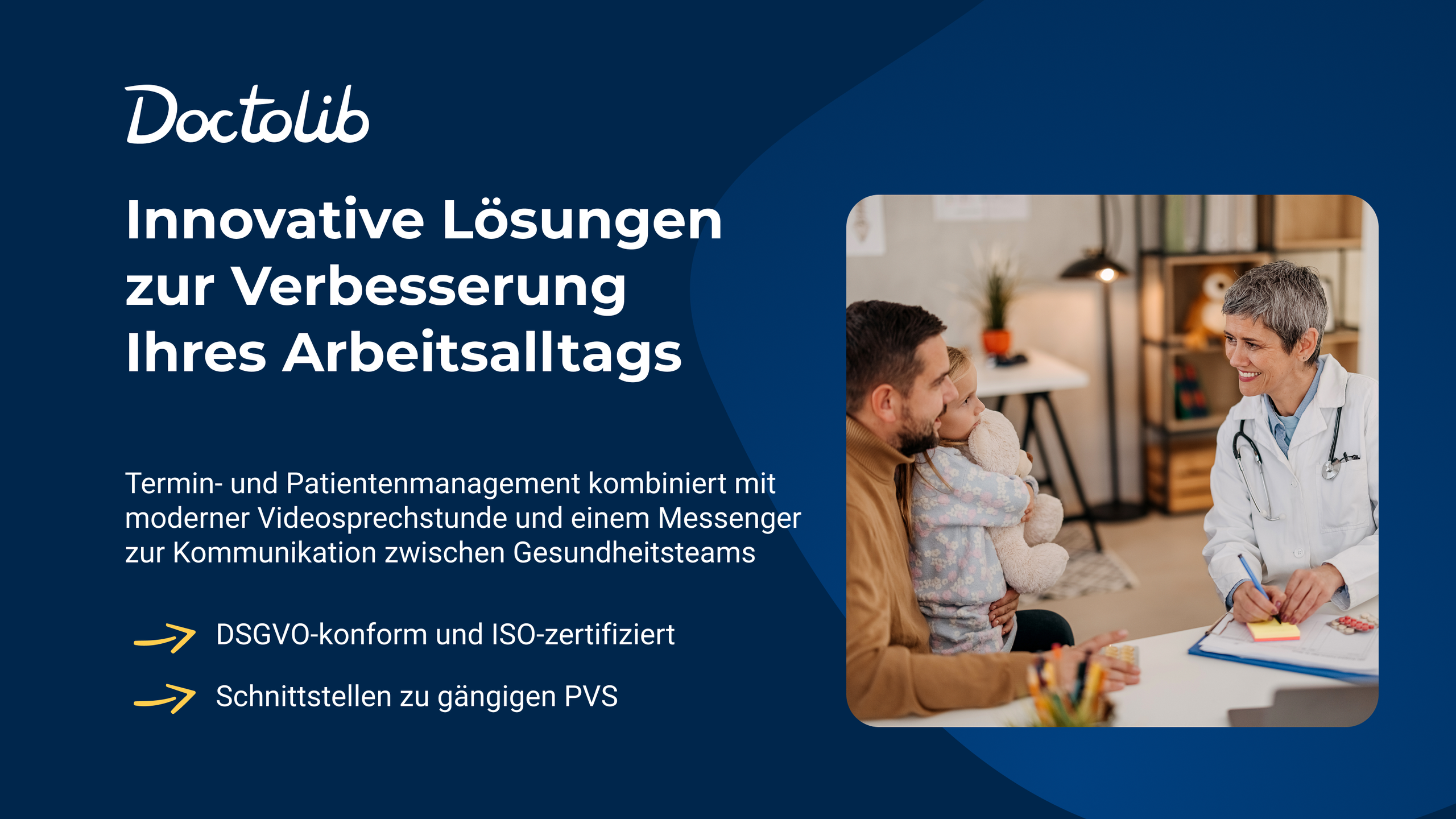 Doctolib ist eines der führenden europäischen Health-Tech-Unternehmen. Mehr als 410.000 Gesundheitsfachkräfte und 80 Mio. Patient:innen europaweit vertrauen bereits auf die Softwarelösungen des Unternehmens. Doctolib entlastet Gesundheitsfachkräfte fachgruppen- und sektorenübergreifend in ihrem Arbeitsalltag. Neben einer Komplettlösung für das Patienten- und Terminmanagement bietet Doctolib auch eine Videosprechstunde und DSGVO-konformen Messenger für Ärzt:innen und Gesundheitsteams.