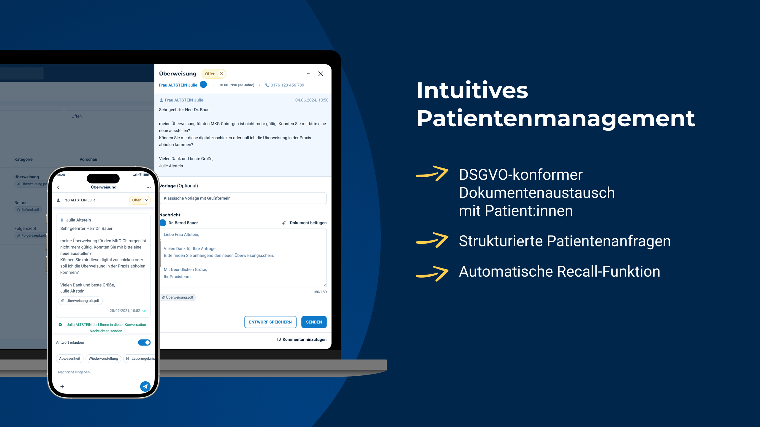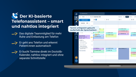 Online-Terminmanagement, Terminerinnerung, digitale Warteliste, digitale Patientenanfragen, digitaler Dokumentenaustausch, Ressourcenmanagement, automatischer Recall, Messenger, Videosprechstunde, Überweisernetzwerk, Abwesenheitsmanagement, KI-basierter Telefonassistent, Aufgaben-Manager