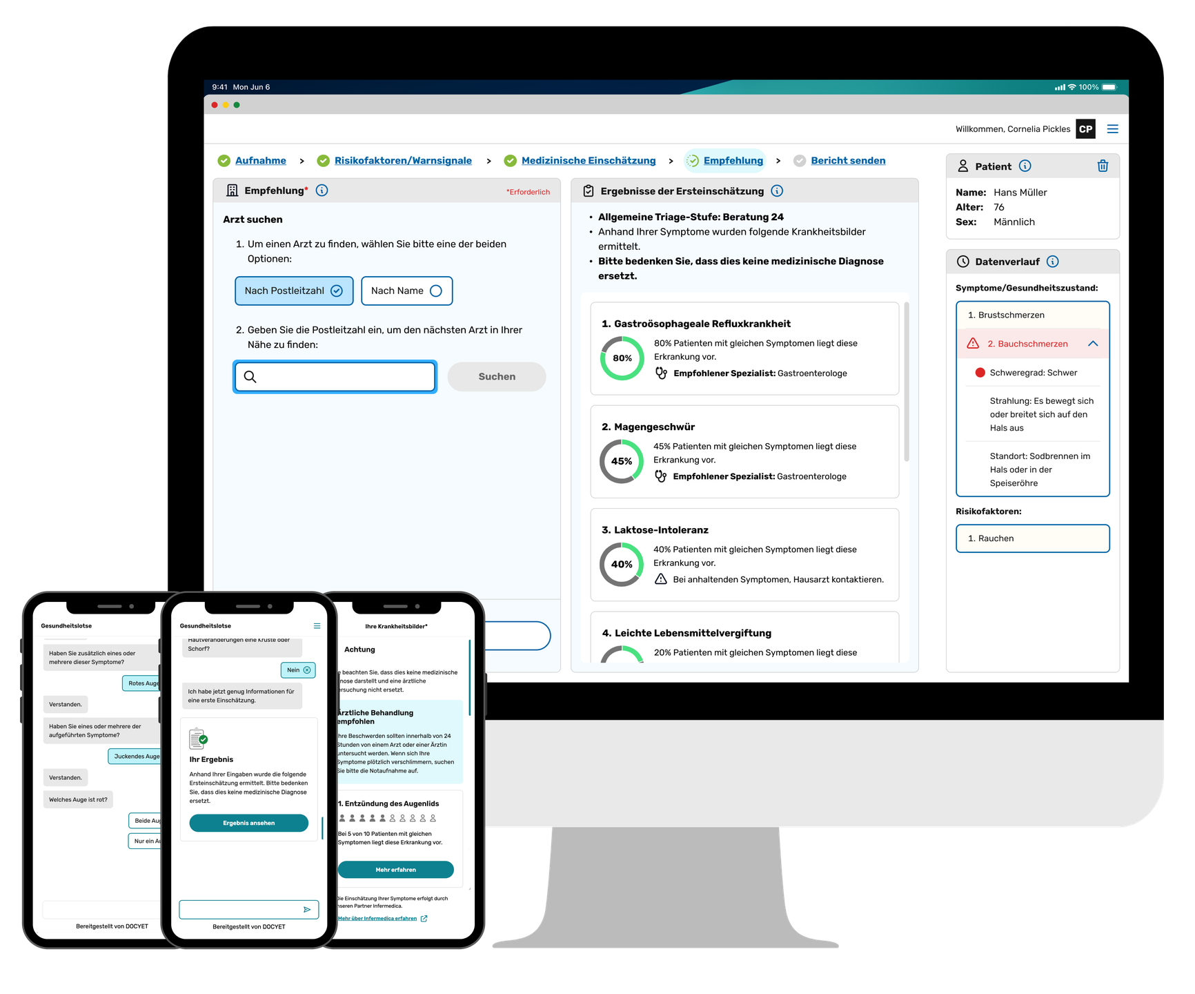 - Entlastung der Akutsprechstunde durch die digitale Eigenanamnese direkt im Eingangs- oder Wartebereich.